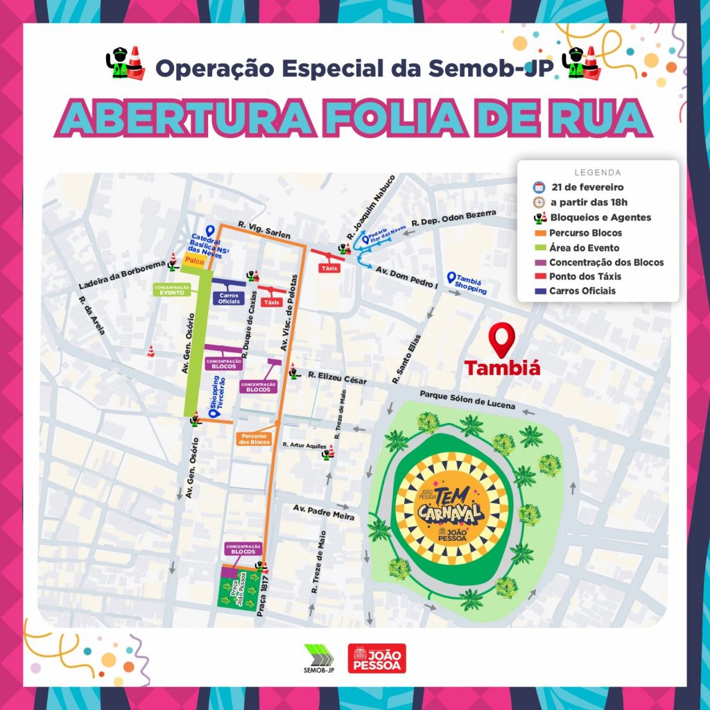 A Superintendência Executiva de Mobilidade Urbana de João Pessoa (Semob-JP) planejou para esta sexta-feira (21), dia da abertura do Folia de Rua 2025, que irá acontecer na Avenida General Osório, Centro Histórico, uma operação especial de trânsito e transporte. O objetivo do esquema é garantir a segurança viária, o disciplinamento do fluxo de veículos e os deslocamentos dos usuários de ônibus até o local do evento, que terá como atrações musicais Elba Ramalho, Cátia de França e Filipe Santos.