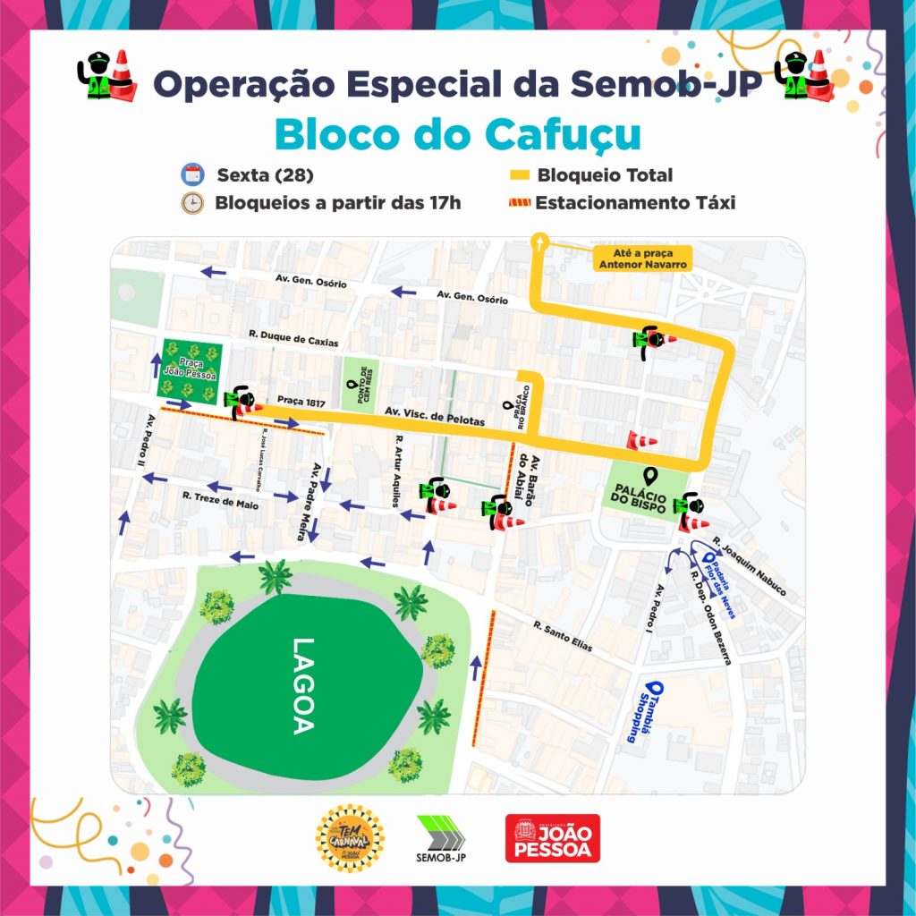 Trânsito – A partir das 17h, agentes de mobilidade vão bloquear totalmente o fluxo de veículos nos trechos do corredor de passagem dos foliões, que inclui a Praça João Pessoa, Praça 1817, Avenida Visconde de Pelotas, Praça Dom Adauto, Avenida General Osório (Catedral) e Praça Antenor Navarro.