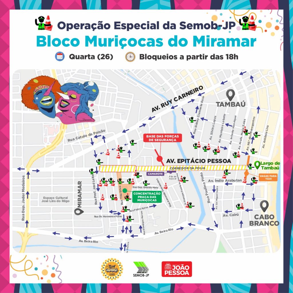 A Superintendência Executiva de Mobilidade Urbana (Semob-JP) montou um esquema especial de trânsito e transporte para garantir a segurança viária dos foliões que vão brincar no Muriçocas do Miramar, que desfila na noite desta quarta-feira (26) na Via Folia. Serão 60 agentes de mobilidade que atuarão orientando, fiscalizando e monitorando a circulação de veículos, como também vai ter o reforço de ônibus para a ida e volta do evento.