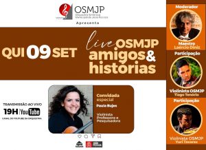 O programa da série Amigos & Histórias desta quinta-feira (9), realizado pela Orquestra Sinfônica Municipal de João Pessoa (OSMJP), traz como convidada especial a violinista, professora e pesquisadora Paula Bujes. Ela vai falar sobre sua trajetória profissional, a paixão pelo violino e também vai relembrar a participação na OSMJP. O encontro será transmitido ao vivo no canal da Orquestra no YouTube a partir das 19h.