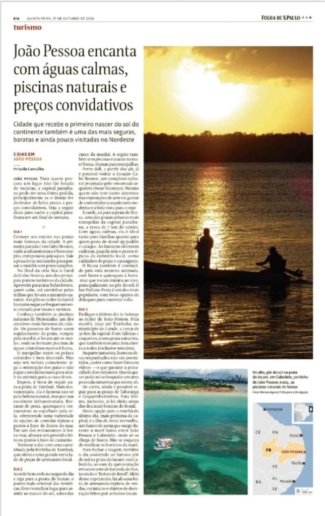 João Pessoa foi protagonista na edição do jornal Folha de São Paulo, em suas versões impressas e online, desta quinta-feira (17), e o título da reportagem por si só reforça a ampliação do fluxo de turistas na Capital paraibana. A reportagem, escrita pela jornalista Priscila Carvalho, valoriza os principais elementos e atrativos de João Pessoa como um dos destinos mais belos pela sua natureza, mais seguros e mais baratos do país: “João Pessoa encanta com as suas águas calmas, piscinas naturais e preços convidativos”, destaca o título.