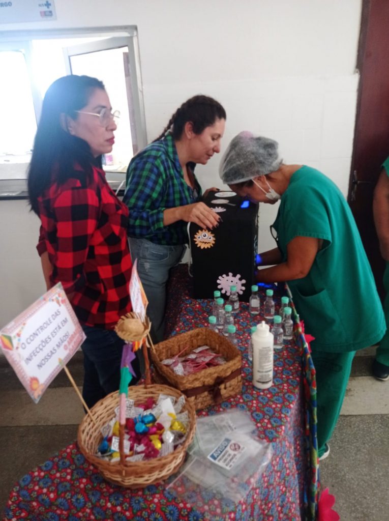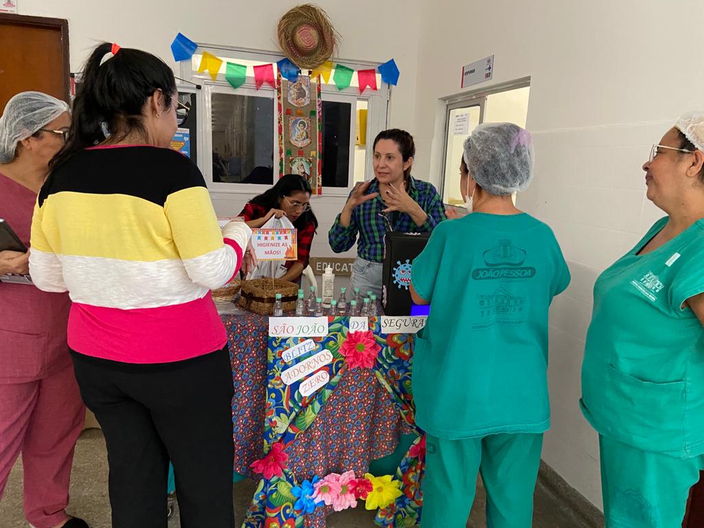 Durante o ‘São João da Segurança’ foram realizadas ações itinerantes e fixa. A fixa foi feita pela Meta 4 (cirurgia segura) e a Meta 5 (higienização das mãos). Já as coordenações responsáveis pelas metas 1 e 2 realizaram ações itinerantes nos setores, reforçando a importância da identificação segura do paciente, da identificação segura em relação aos exames, que devem conter o nome do paciente e todos os indicadores, e sobre comunicação efetiva.