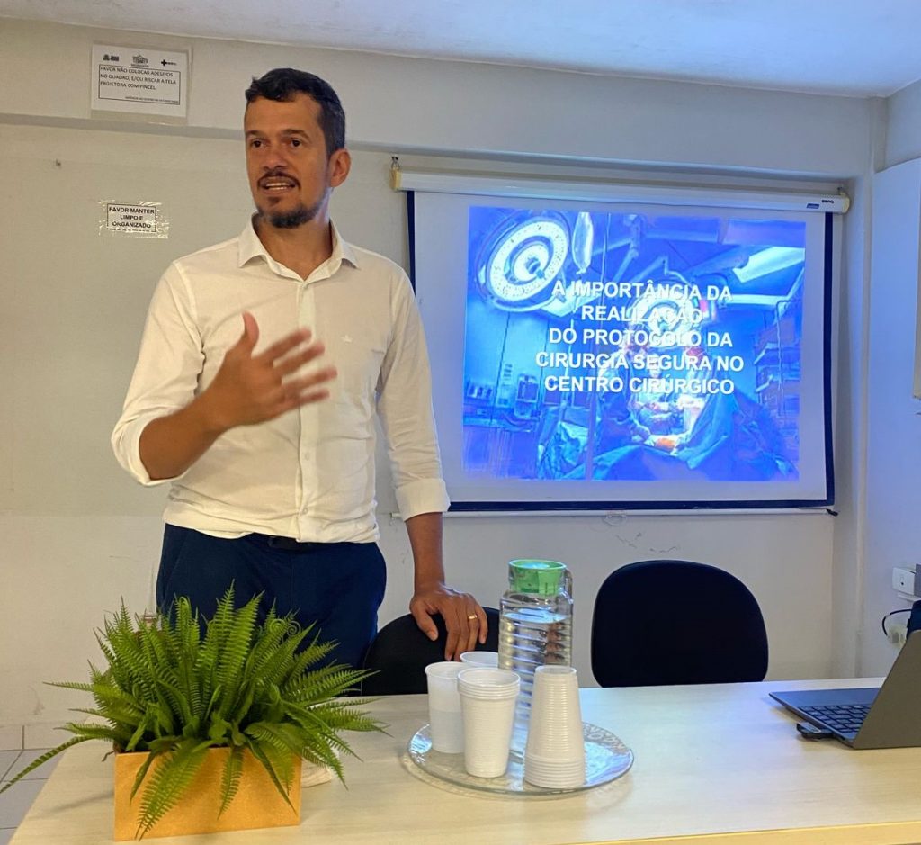 Os protocolos de cirurgia segura são um conjunto de ações que têm como objetivo garantir a segurança do paciente durante o procedimento cirúrgico. O treinamento foi ministrado pelo enfermeiro Geandro da Cunha, especialista em instrumentação. “São diretrizes que todo hospital tem, que faz com que a cirurgia seja segura, que garantem a segurança do paciente, da equipe médica e da equipe de enfermagem”, destacou.
