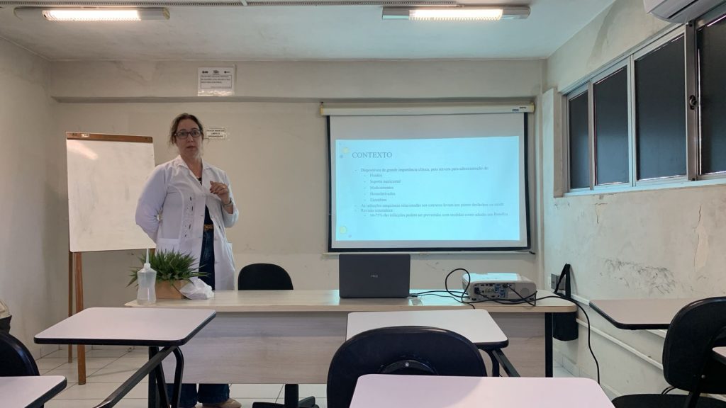 O treinamento foi ministrado pela médica infectologista Tatiana Villar, que abordou a importância da adesão ao bundle – conjunto de práticas recomendadas -, de inserção dos cateteres venosos centrais. Ela ressaltou que as infecções de corrente sanguínea são classificadas como as que têm o pior desfecho clínico para o paciente. “São as que prolongam mais o tempo de internação, que custam mais e que levam, normalmente, a um desfecho que não é positivo para o paciente. Daí a importância do treinamento para prevenir as infecções”, disse a infectologista.