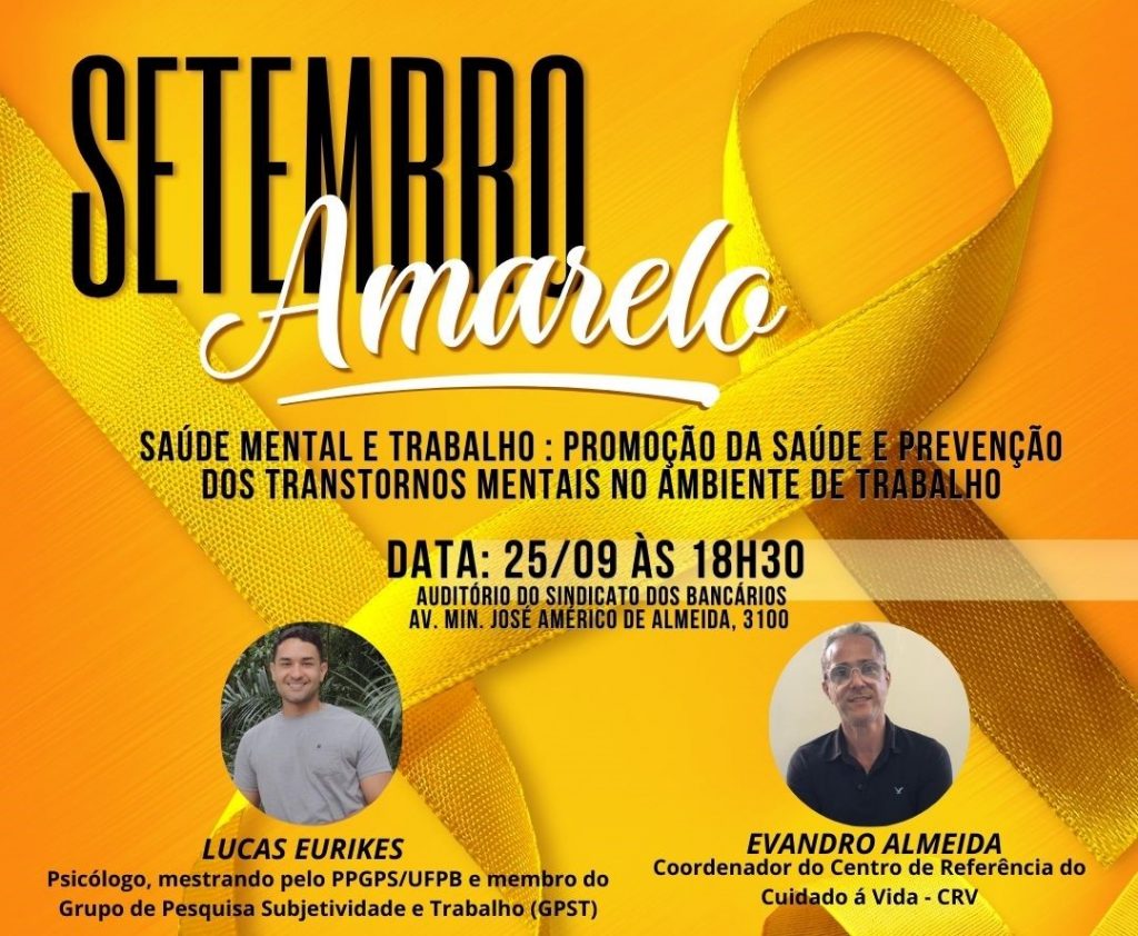 Em alusão ao Setembro Amarelo, mês de prevenção ao suicídio, a Secretaria Municipal de Saúde de João Pessoa (SMS-JP) realiza, na próxima quarta-feira (25), uma mesa temática sobre ‘Saúde Mental e Trabalho: promoção da saúde e prevenção dos transtornos mentais no ambiente de trabalho’. O debate, organizada pelo Centro Regional de Referência em Saúde do Trabalhador (Cerest), será no auditório do Sindicato dos Bancários da Paraíba, que fica localizado na Avenida Beira Rio, a partir das 18h30.