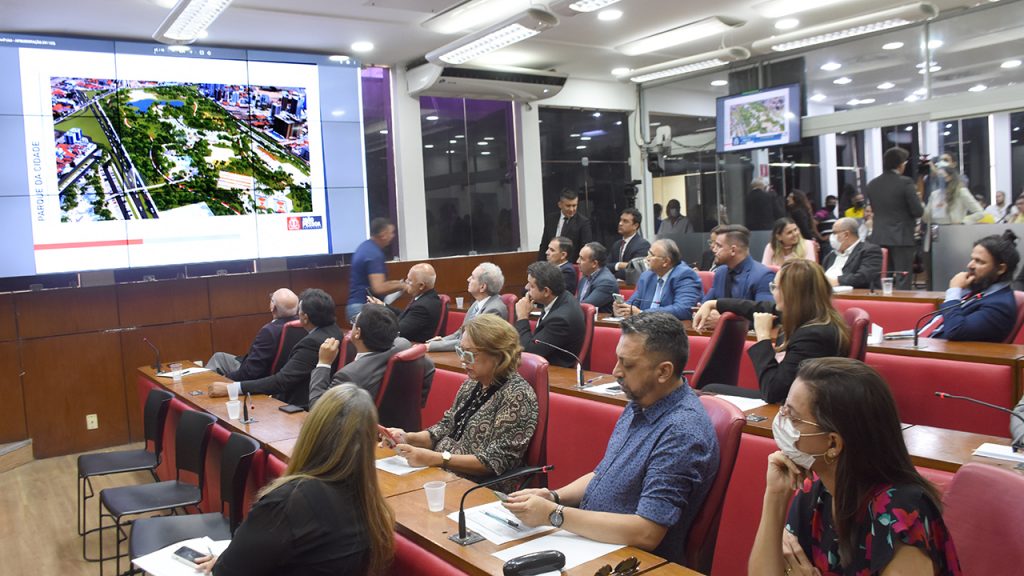 Com a audiência já sob a presidência do vereador Bruno Farias, o secretário de Planejamento fez para os vereadores um resumo dos principais projetos e ações de infraestrutura, transporte público, urbanismo e mobilidade urbana e humana, meio ambiente, habitação social, saúde, educação e tecnologia.
