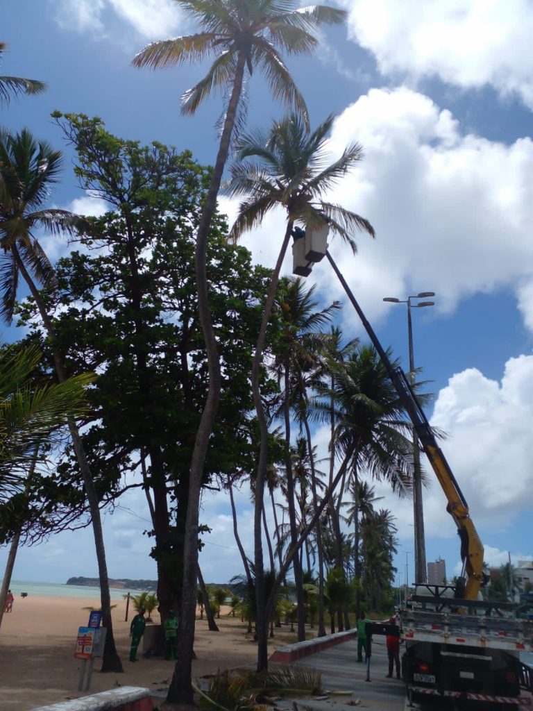 A Prefeitura de João Pessoa, por meio da Secretaria de Desenvolvimento Urbano (Sedurb), vem intensificando a limpeza dos coqueiros na orla marítima e está concluindo o serviço na praia do Cabo Branco, uma das mais extensas da cidade. A ação já foi realizada nos trechos das praias do Bessa, Manaíra e Tambaú.