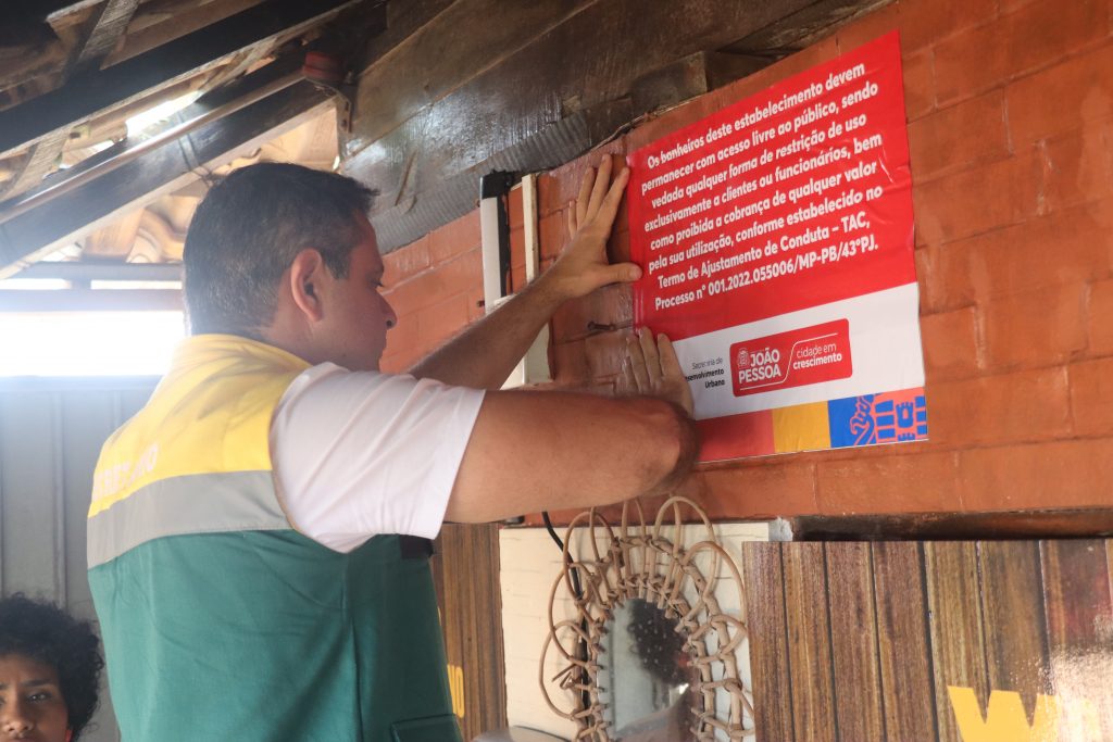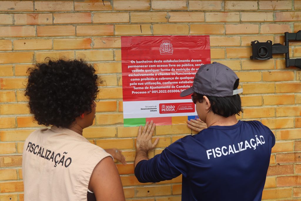 A Secretaria de Desenvolvimento Urbano (Sedurb), realizou mais uma fiscalização na Orla de João Pessoa. Na ocasião, foram afixados adesivos informativos nos bares e quiosques localizados no calçadão das praias de Tambaú e Cabo Branco, reforçando a mensagem sobre os banheiros destes locais, pois o acesso é gratuito e um direito da população.