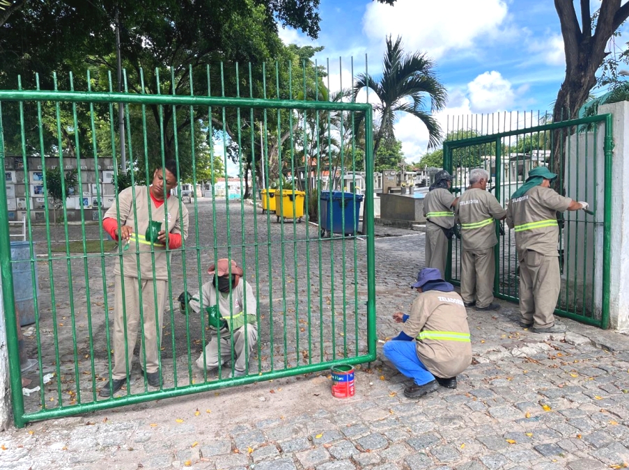 Cemitérios e Cecaf – O Cemitério do Cristo, no bairro Cristo Redentor, foi outro equipamento que recebeu serviços neste mês. Entre eles, a pintura: do prédio da administração, da central de velório, capela, grades e do portão principal. Na Central de Comercialização da Agricultura Familiar (Cecaf), no José Américo, ocorreu a limpeza e manutenção de calhas, retirada de vazamento em janela e manutenção em banheiro do primeiro andar.