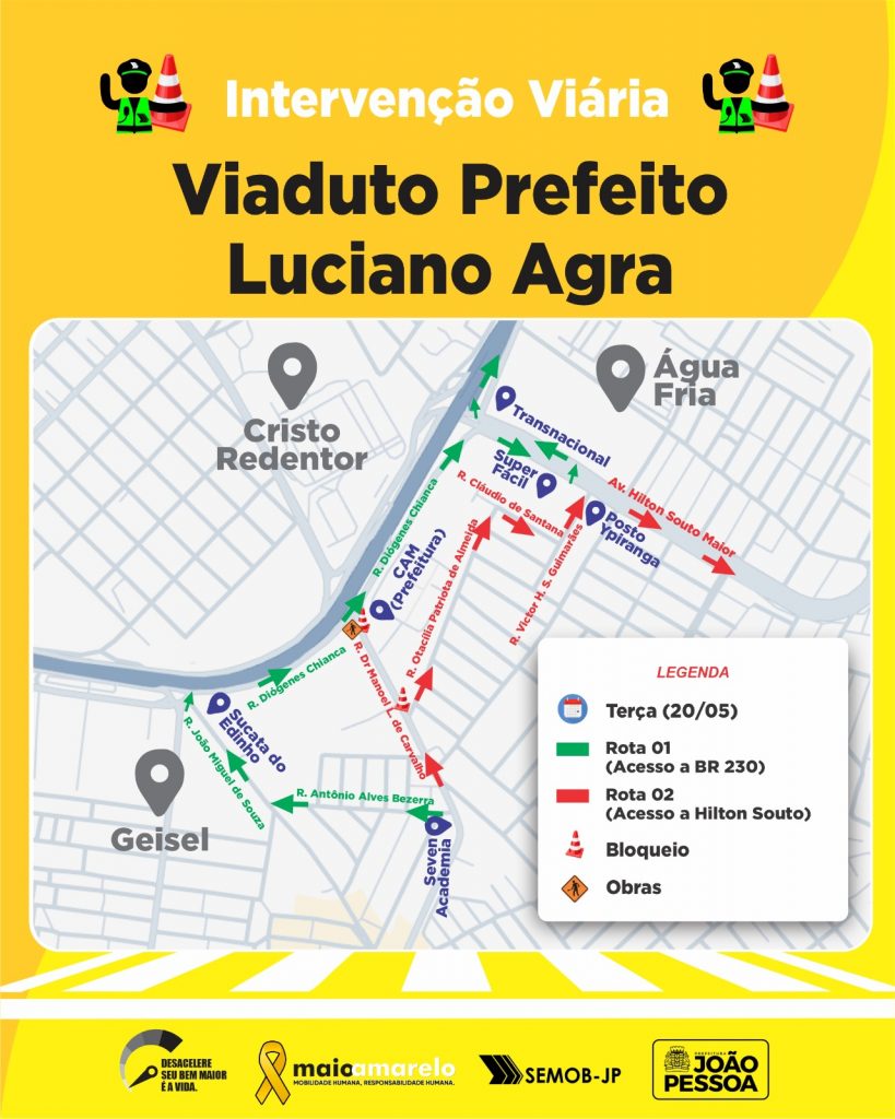 Na próxima terça-feira (20) o Departamento de Estradas de Rodagem (DER) vai iniciar a segunda etapa das obras no entorno do novo Viaduto Luciano Agra, localizado na BR-230, entre os bairros de Água Fria e Cristo Redentor. Com o objetivo de reduzir os transtornos no tráfego, a Superintendência Executiva de Mobilidade Urbana (Semob-JP) vai iniciar uma intervenção viária na região, realizando interdições e viabilizando rotas alternativas aos condutores.