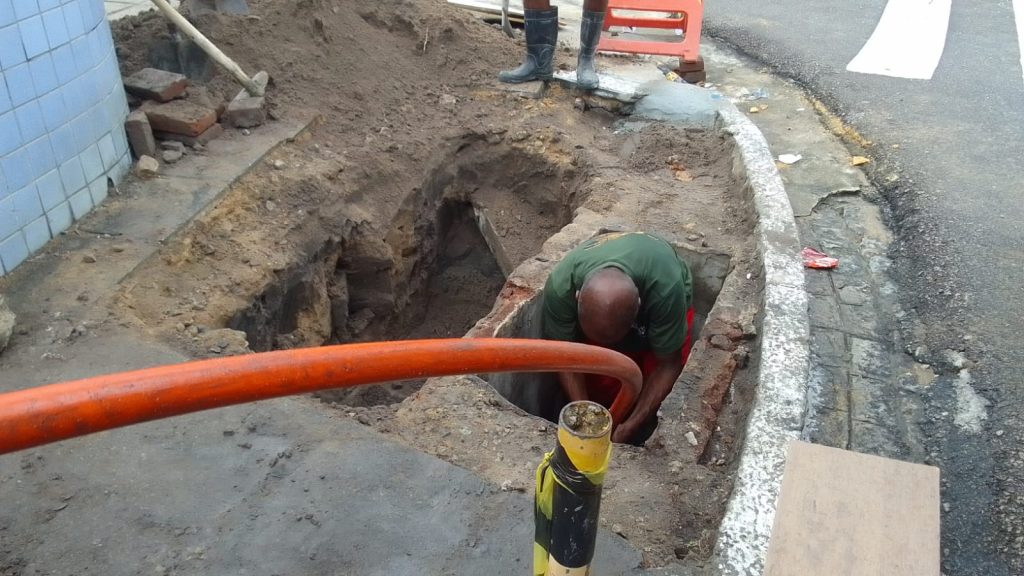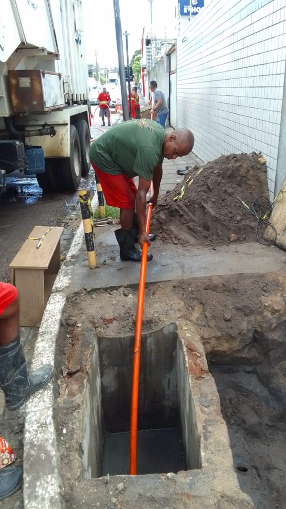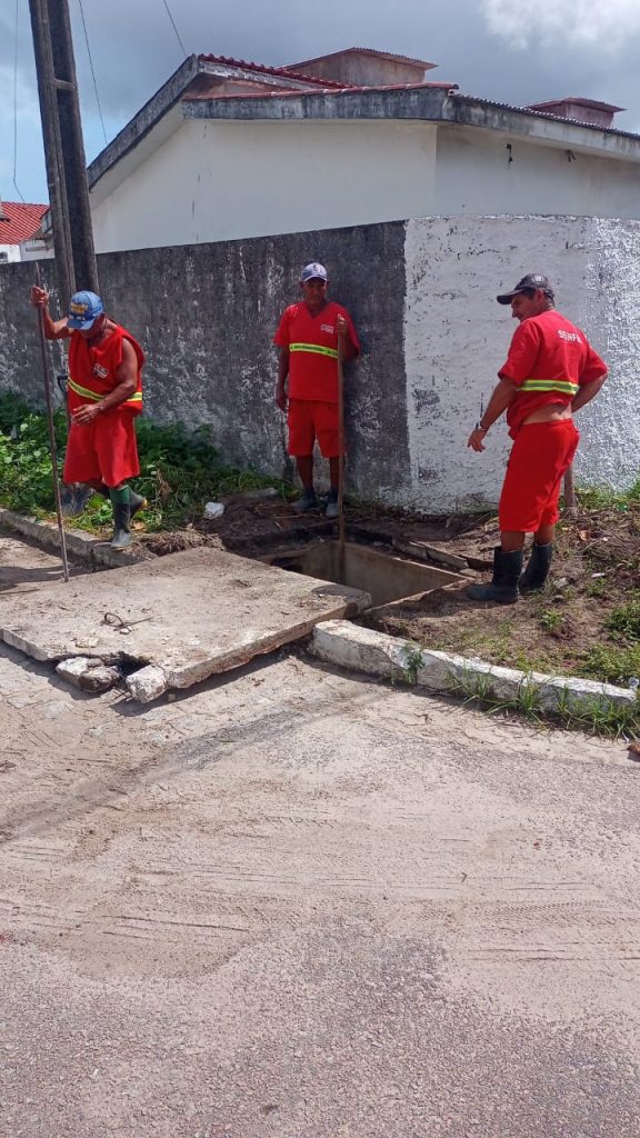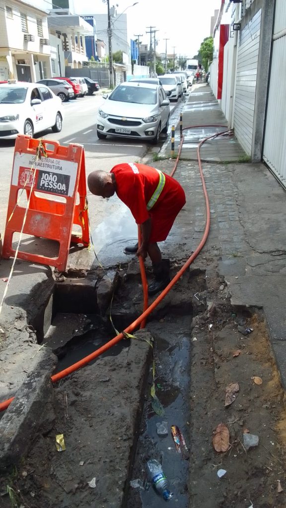 Os trabalhos na rede de drenagem em execução hoje são remoção de entulhos, limpeza de galerias com recuperação e colocação de placas e grelhas nos bairros do Centro, Cidade Verde e Paratibe.