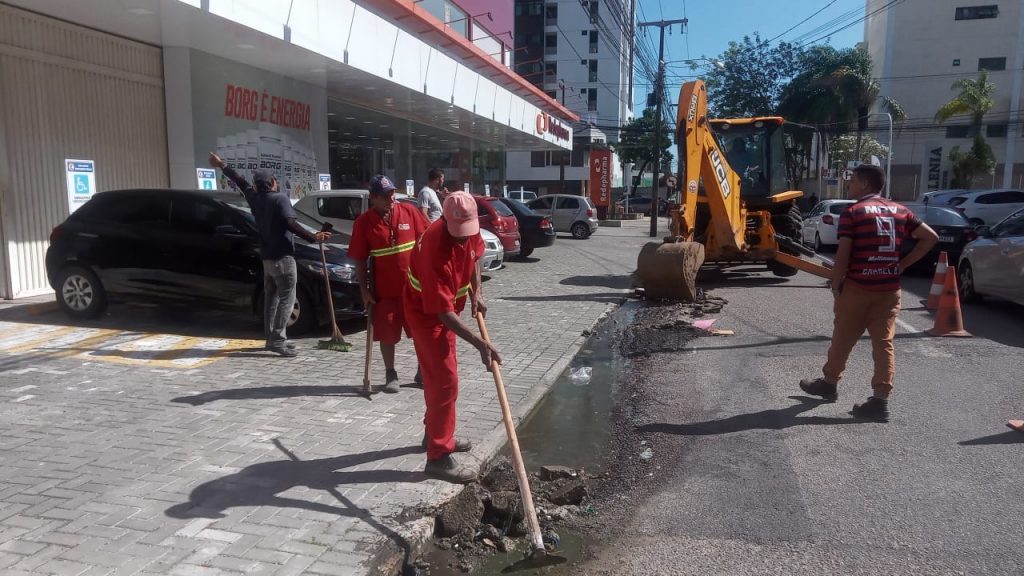 As equipes de manutenção de galerias estão realizando serviços de colocação de tubo para travessia e retirada de rampa, verificação de afundamento da pavimentação e reaterro de afundamento da pavimentação nos bairros dos Expedicionários; Centro; Funcionários II.