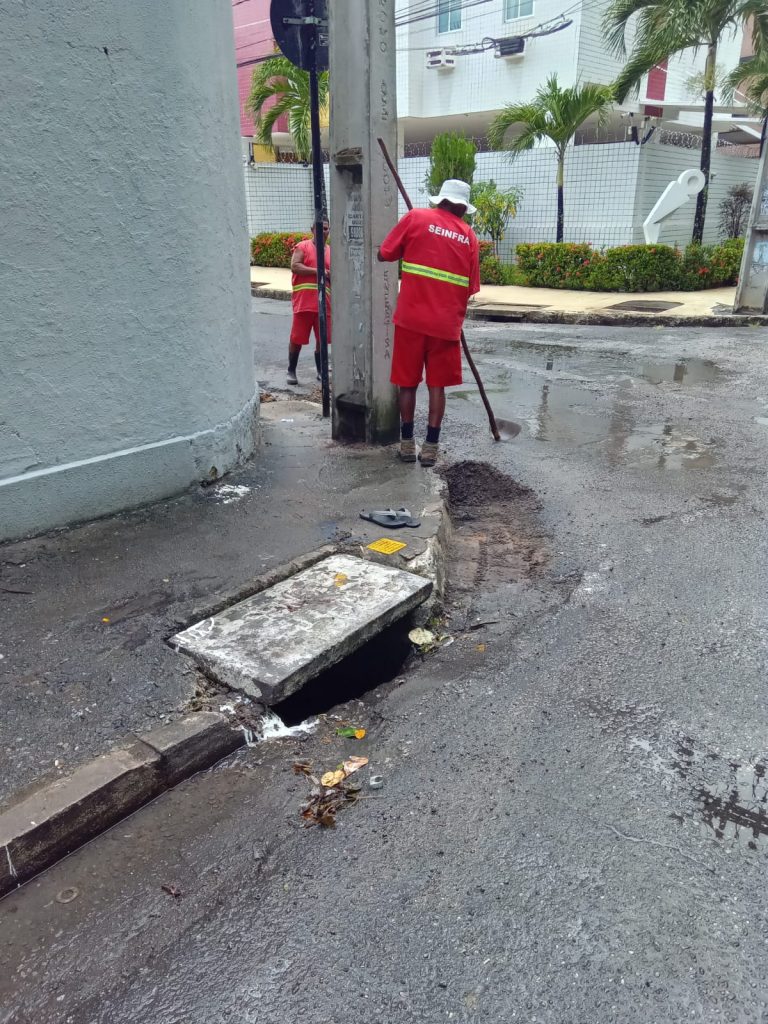 Os trabalhos na rede de drenagem em execução nesta terça-feira são remoção de entulhos, limpeza de galerias e abertura de lançamentos nas localidades de Cristo, Esplanada, Paratibe, Valentina, Cabo Branco, Tambaú, Manaíra e Roger.