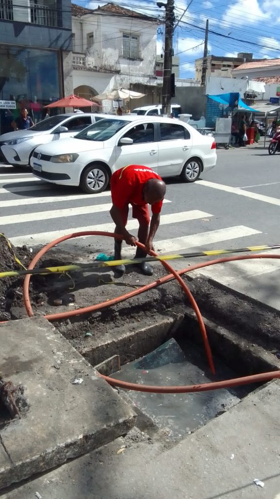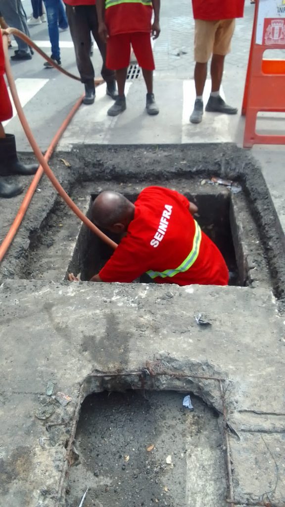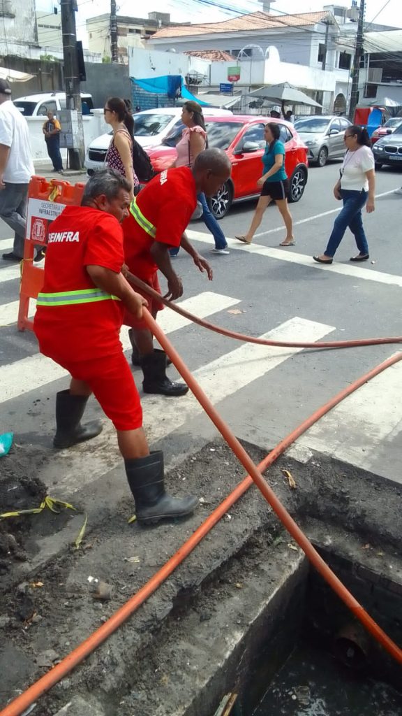 Os serviços na rede de drenagem realizados hoje são: limpeza e desobstrução com remoção de entulhos, que acontecem nos seguintes bairros: Oitizeiro, Centro e Varadouro.