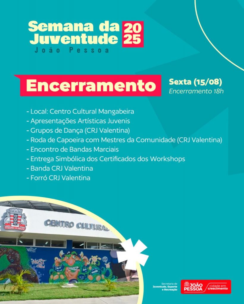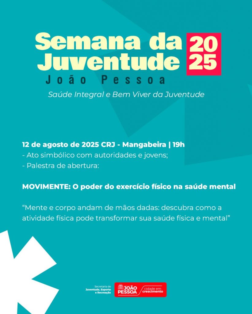 A Prefeitura de João Pessoa, por meio da Secretaria de Juventude, Esporte e Recreação (Sejer), promove, até a próxima sexta-feira (15), a Semana Municipal da Juventude, voltada para jovens entre 15 e 29 anos. A programação começa na noite desta terça-feira (12), a partir das 19h, no Centro de Referência da Juventude (CRJ), em Mangabeira. As atividades serão realizadas em três CRJs e no Centro Cultural de Mangabeira.