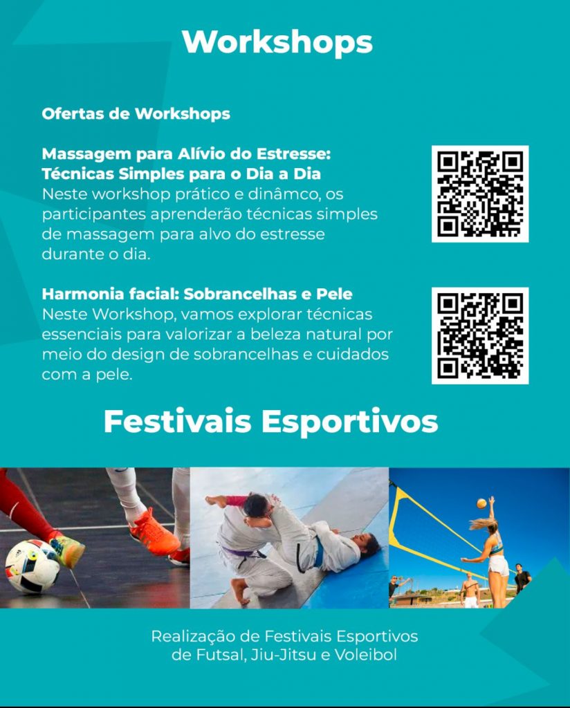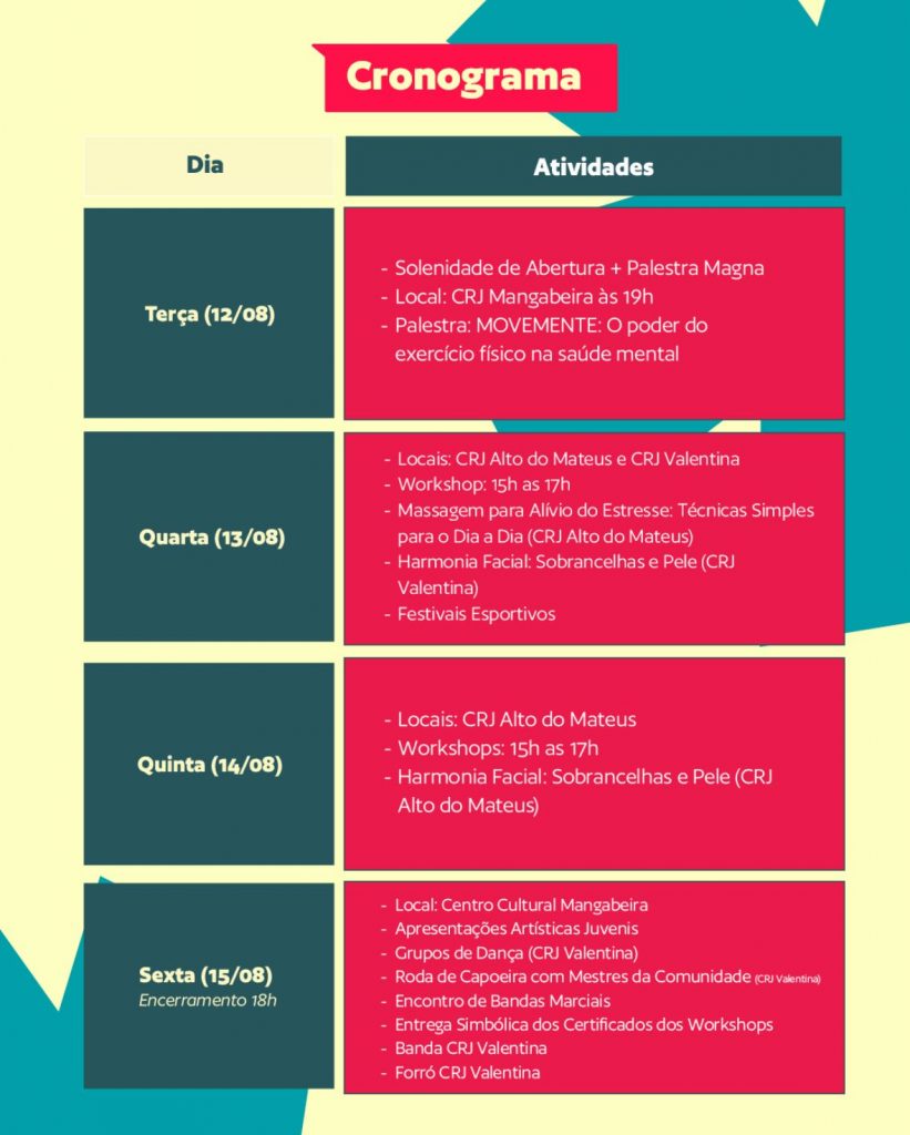 A solenidade de abertura contará com uma Palestra Magna, com o tema ‘Movemente: O poder do exercício físico na saúde mental’. Na quarta-feira (13) e na quinta-feira (14), durante a tarde, serão oferecidos à comunidade workshops com cursos de maquiagem – harmonia facial, design de sobrancelhas e cuidados com a pele, no CRJ Valentina, localizado na Rua Padre Emiliano, s/n. Já no CRJ do Alto do Mateus, apenas na quarta-feira (13), serão realizados cursos de técnicas simples para massagem de alívio do estresse, além de apresentações esportivas.