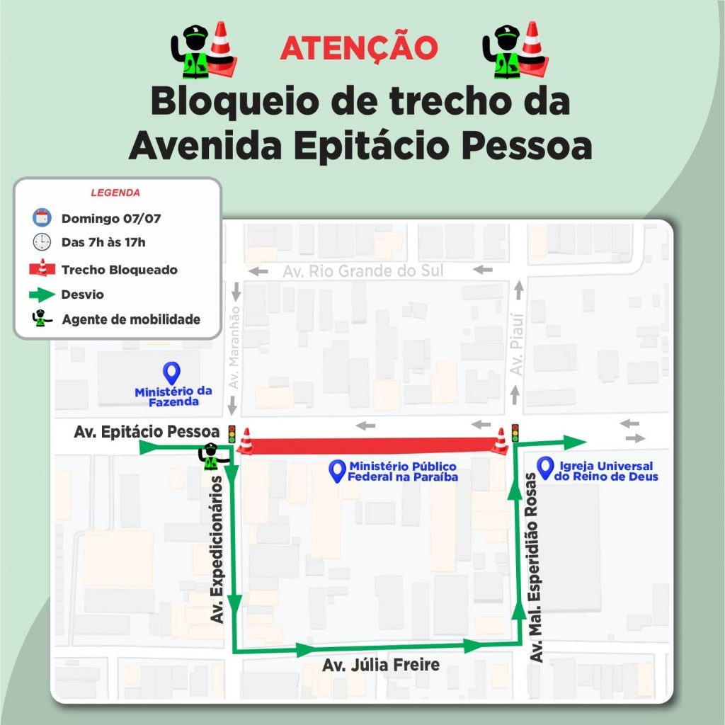 A Superintendência Executiva de Mobilidade Urbana de João Pessoa (Semob-JP) informa à população que, no próximo domingo (07), um trecho da Avenida Epitácio Pessoa estará com bloqueio total do trânsito. A medida será promovida a pedido do Ministério Público Federal (MPF) para que seja realizado um serviço de içamento do sistema de ar-condicionado no prédio do órgão.