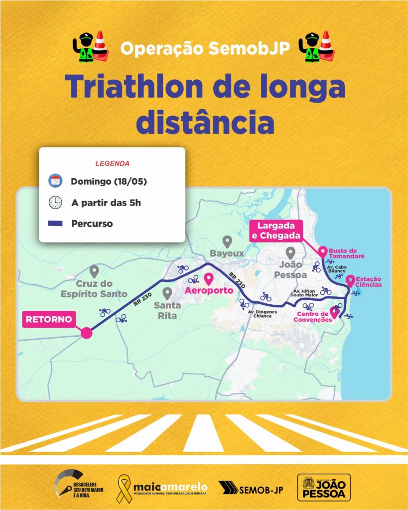 Triathlon de longa distância – Neste domingo (18), acontece o Half Distance João Pessoa, que tem o apoio da Fundação Campeões do Amanhã e da Secretaria Municipal da Juventude Esporte e Recreação. A prova contará com natação, 90 km de ciclismo e meia maratona. Após a natação, partindo às 5h, do Busto de Tamandaré, os ciclistas seguem na Avenida Cabo Branco, Estação Ciência e seguem pelas Avenidas Hilton Souto Maior e Ranieri Mazilli, depois BR-230, Bayeux, Santa Rita e Cruz do Espírito Santo, ponto de retorno de 45 km, de onde farão o trajeto inverso até o Centro de Convenções, na PB-008. A partir daí, os atletas iniciam a meia maratona de 21 km, na Avenida Cabo Branco.