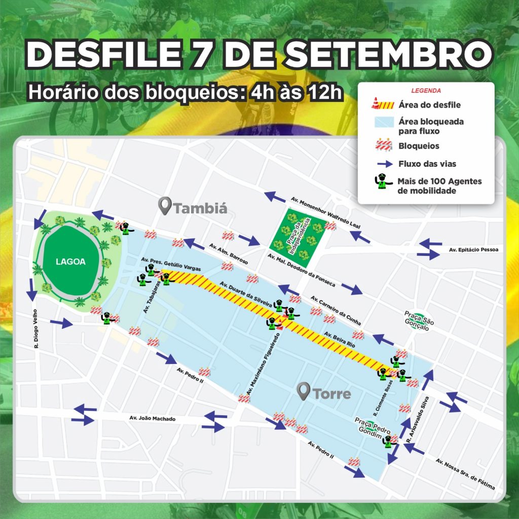 Com o objetivo de garantir a fluidez do tráfego de veículos e a segurança viária dos pedestres no local e entorno onde ocorrerão os desfiles cívicos, neste sábado, 7 de Setembro, a Superintendência Executiva de Mobilidade Urbana de João Pessoa (Semob-JP), definiu os planos de trânsito e transportes que serão executados nas avenidas Getúlio Vargas e Duarte da Silveira, trecho compreendido entre as avenidas Tabajaras, Maximiano Figueiredo, Clemente Rosas e vias próximas.