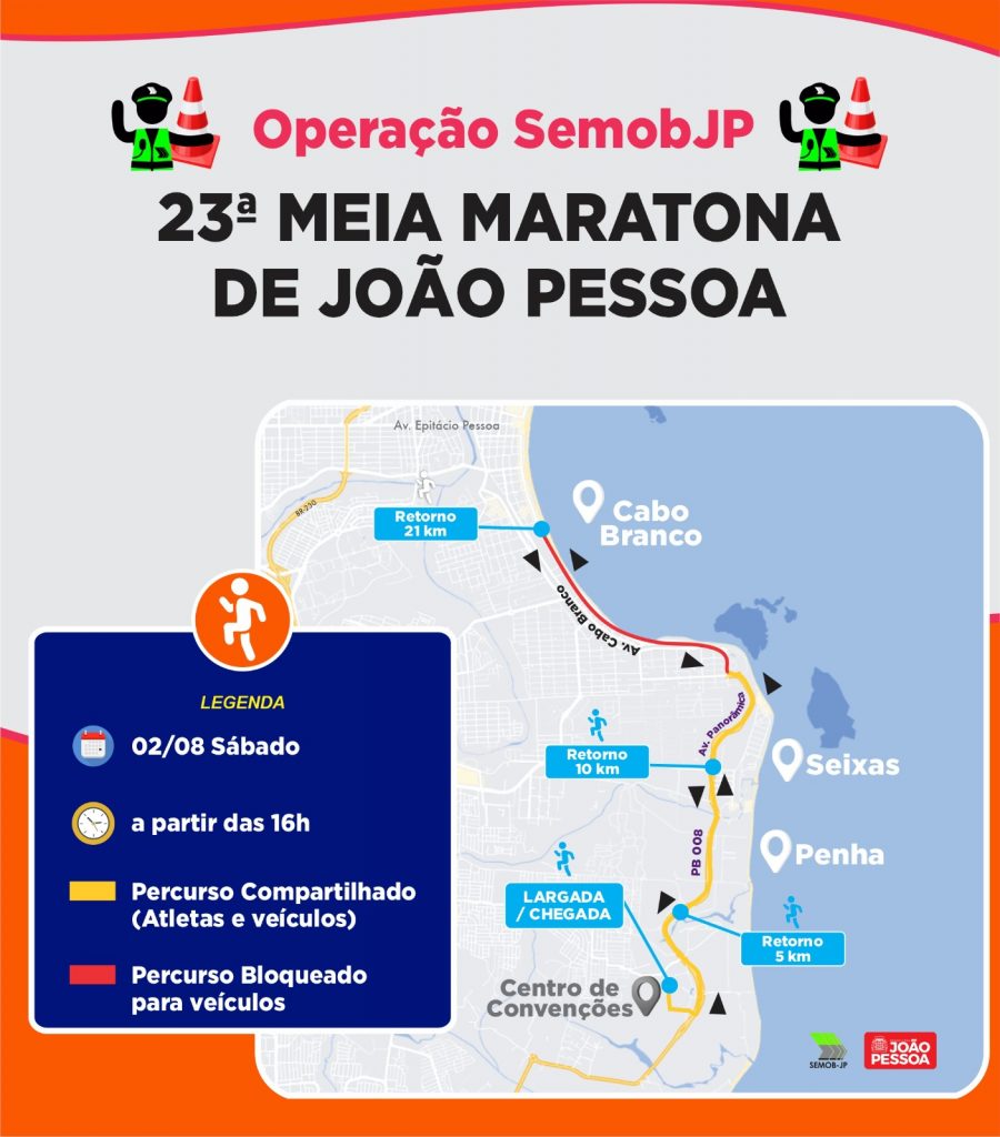 23ª Meia Maratona – No sábado, a partir das 16h, com largada e chegada no Centro de Convenções, os atletas percorrerão a PB-008 (Penha e Seixas), a Avenida Panorâmica (Altiplano) e Avenida Cabo Branco (Cabo Branco), com retorno em frente ao Sesc Cabo Branco, fazendo o percurso inverso, até a chegada no Centro de Convenções, totalizando os 21 quilômetros. Todo o trajeto será devidamente sinalizado e acompanhado de perto pelas equipes da Semob-JP. Portanto, os condutores de veículos devem ficar atentos à sinalização e aos comandos dos agentes.