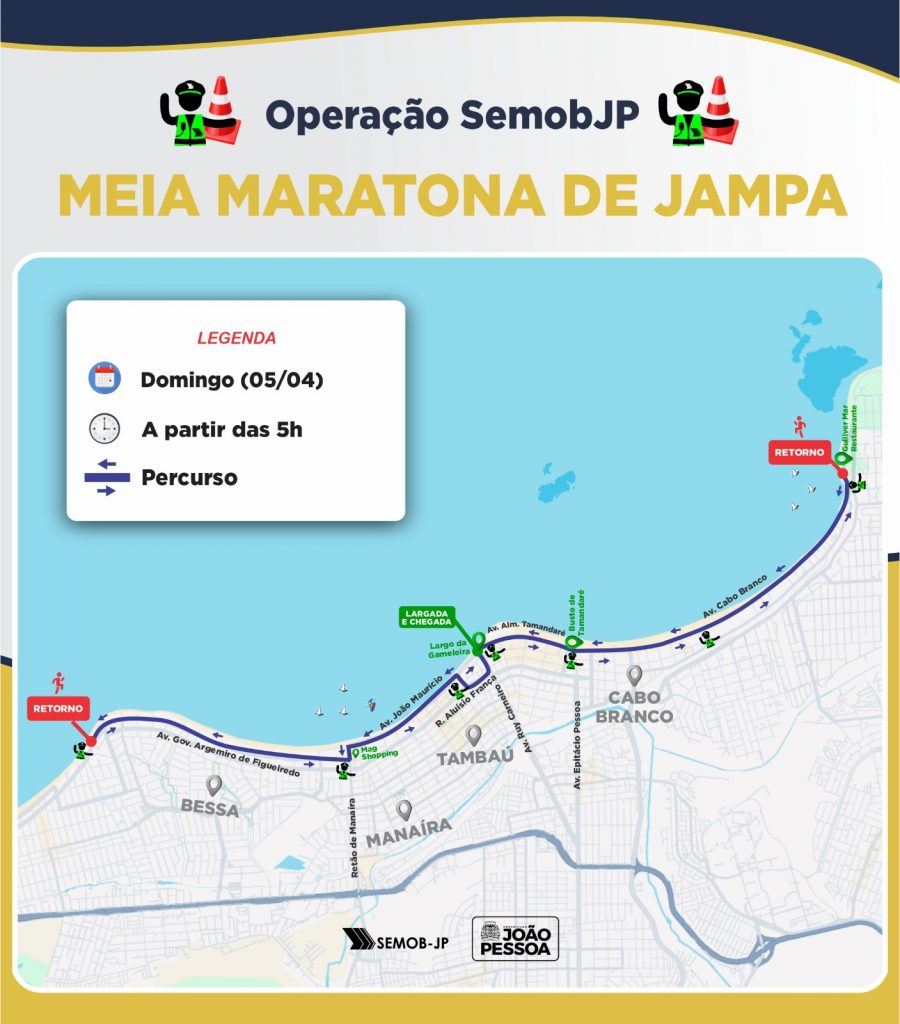 A Superintendência Executiva de Mobilidade Urbana (Semob-JP) define o plano operacional para a Meia Maratona Jampa 21K, neste domingo (5), a partir das 5h. O esquema especial de trânsito tem como objetivo assegurar a segurança viária, a fluidez do tráfego e a proteção de pedestres e condutores durante as atividades.