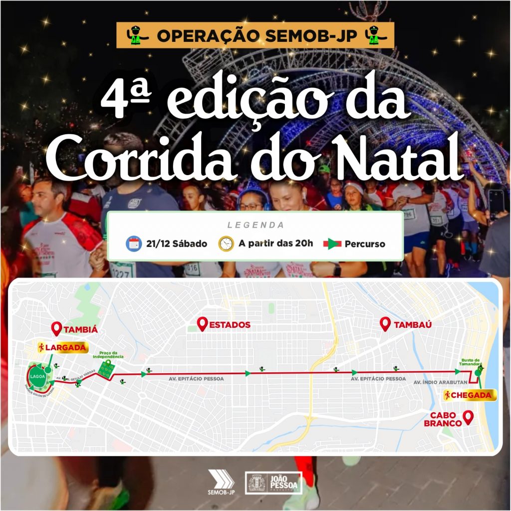 A Prefeitura de João Pessoa, por meio da Superintendência Executiva de Mobilidade Urbana (Semob-JP), preparou um esquema de trânsito para a 4ª edição da ‘Corrida do Natal’, que vai ser realizada, neste sábado (21). A intervenção tem o objetivo de garantir a segurança viária dos participantes e o bloqueio temporário do fluxo de veículos ao longo do trajeto da prova.