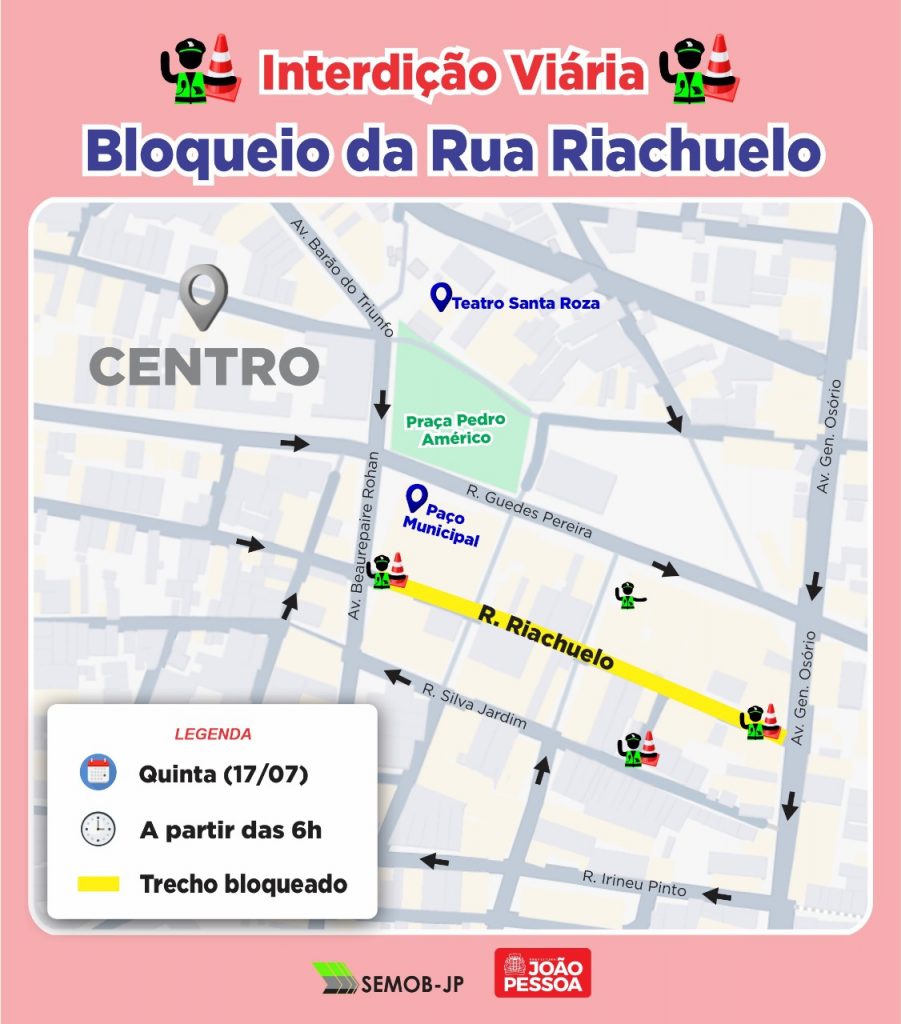 A Superintendência Executiva de Mobilidade Urbana de João Pessoa (Semob-JP) recebeu a solicitação de interdição total da Rua Riachuelo, localizada próximo ao Paço Municipal, para viabilizar a retirada de entulhos oriundos da obra de requalificação do prédio histórico. A interdição está prevista para ocorrer nesta quinta-feira (17), das 7h às 17h, em caráter emergencial.