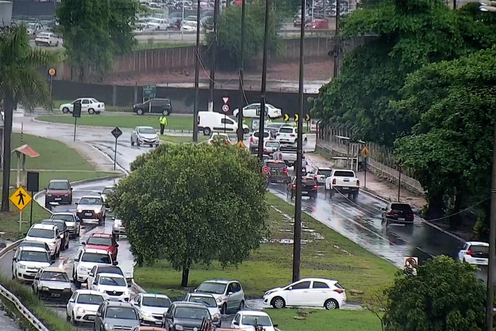Desde às 6h, o Centro Operacional de Trânsito e Transporte (COTT) está observando através de 70 câmeras os trechos que apresentam pista com acúmulo de água, acionando os 40 agentes de mobilidade em campo e promovendo as intervenções viárias necessárias.