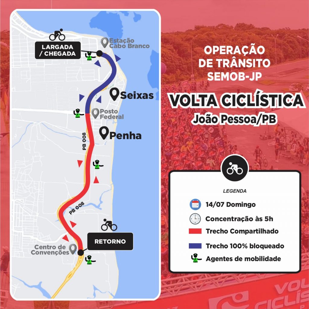 Mas, nesta competição com ciclistas, os atletas seguirão pelas pistas, sentido Litoral Sul, com a particularidade que haverá bloqueio total nos dois sentidos, entre o Posto Federal (entrada do Seixas) e a Estação Cabo Branco. Já no restante do percurso, ou seja, entre o Posto Federal (entrada do Seixas) e o Centro de Convenções, o fluxo será compartilhado entre bicicletas e demais veículos.