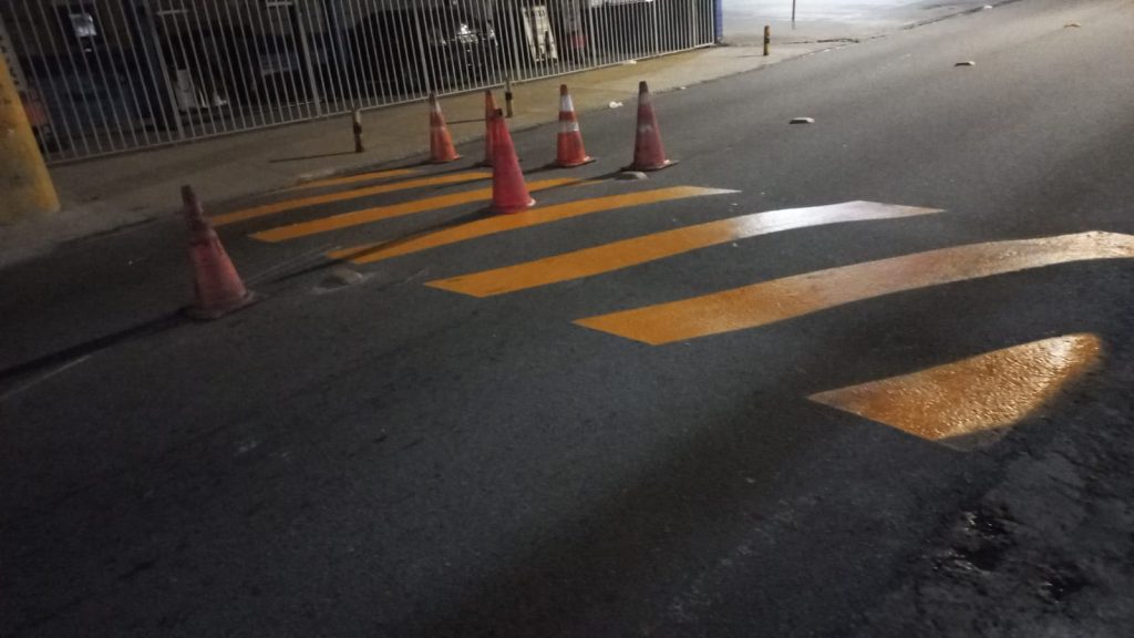 Durante toda a noite, equipes da DSV trabalharam intensamente na restauração da pintura de um total de 8 oito faixas de travessia de pedestres, para garantir que essas faixas estejam em condições adequadas de serem identificadas e utilizadas, e cumpram o seu papel de espaço seguro para o pedestre cruzar a via e evitar a ocorrência de acidentes. A revitalização da sinalização horizontal (pintura) e vertical (placas) é permanente.