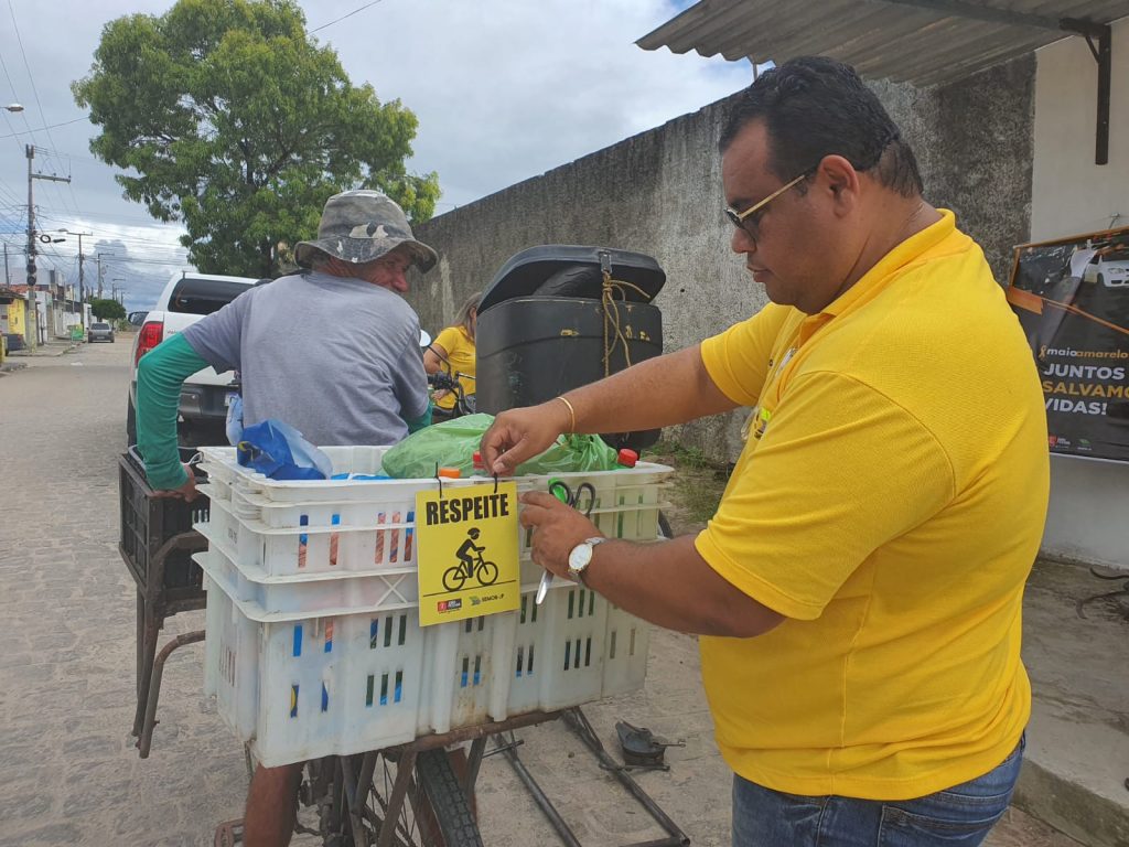 A Superintendência Executiva de Mobilidade Urbana de João Pessoa (Semob-JP) segue com a programação de atividades alusivas ao Maio Amarelo, movimento mundial com a proposta de um trânsito mais seguro para todos, este ano com o tema ‘Juntos Salvamos Vidas’. Nesta quarta-feira (11), a equipe da Divisão de Educação (Died) realizou uma ação itinerante em feiras livres e mercados públicos, com o objetivo de orientar os condutores de carrocinhas, bicicletas e carros de mão e sinalizar estes veículos, melhorando a visualização e segurança quando estão em circulação.