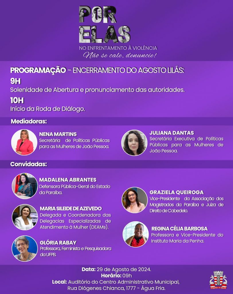 A Prefeitura Municipal de João Pessoa, através da Secretaria Extraordinária de Políticas Públicas para as Mulheres (SEPPM) estará realizando no dia 29 de agosto, das 9h às 12h, no auditório do Centro Administrativo (CAM), no bairro de Água Fria, o encerramento da campanha Agosto Lilás, mês dedicado à conscientização para o fim da violência contra a mulher.