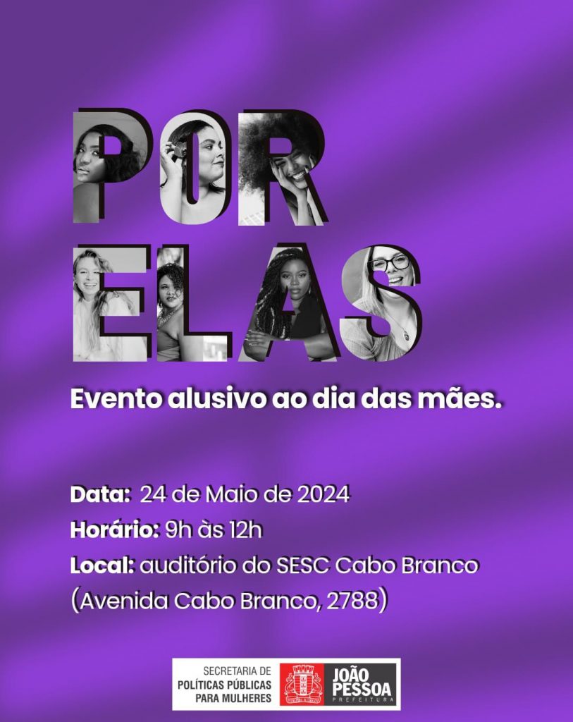 A Prefeitura de João Pessoa, através da Secretaria Extraordinária de Políticas Públicas para as Mulheres (SEPPM), realiza, nesta sexta-feira (24), mais uma edição do projeto “Por Elas: No Enfrentamento à Violência”. O evento, alusivo ao Dia das Mães, comemorado no segundo domingo de maio, acontecerá das 9h às 12h, no auditório do Sesc Cabo Branco, localizado na Avenida Cabo Branco, 2788, na Capital.