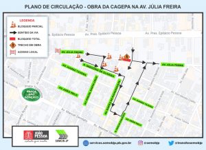 A Superintendência Executiva de Mobilidade Urbana de João Pessoa (Semob-JP) vai monitorar o trecho da obra e todo o seu entorno durante a realização do serviço, que tem previsão para término na próxima sexta-feira (26), conforme o plano de circulação (ver mapa). A Semob-JP recomenda aos condutores de veículos que busquem rotas alternativas e evitem circular próximos ao trecho onde a obra da Cagepa será realizada.