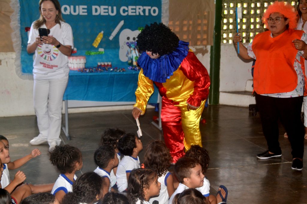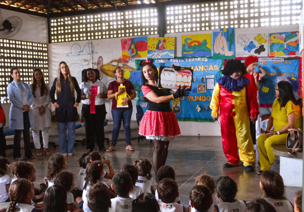 Um dos locais visitados nesta quarta-feira (23) foi o CMEI Assis Tavares, no bairro do Roger. A equipe da Unidade de Saúde da Família (USF) Integrada Varadouro preparou uma manhã com atividades lúdicas como encenações teatrais, música, brincadeiras, brindes e personagens infantis para orientar as crianças sobre escovação e outros cuidados básicos com a saúde bucal.