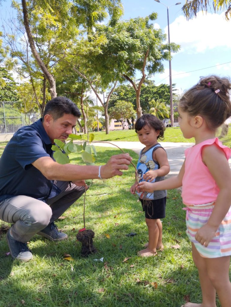 Acompanharam o plantio Antoni Nunes, de dois anos, que estava com o pai, Allan Nunes, além de Letícia Paes Guimarães, de três anos, que estava com a avó Irismar Guimarães. As crianças ajudaram a plantar uma muda de craibeira. Irismar mora nos Bancários, é aposentada e frequenta as Três Ruas diariamente. “Essa ação é muito importante para mantermos a qualidade de vida aqui dessa área, deixando o espaço mais bonito, mais florido, com mais sombra e contribuindo ainda para manter a temperatura mais amena”, concluiu.