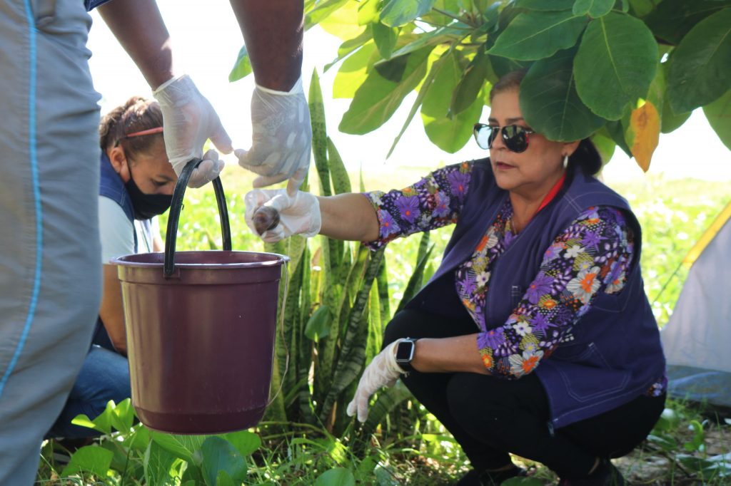 Catação do caracol – Caso o cidadão perceba a presença do caracol em sua residência, ele mesmo pode realizar a catação do molusco, tomando alguns cuidados. “Quando existe a presença desse animal no quintal ou em outro ambiente de sua casa, você deve fazer a catação sempre com as mãos protegidas utilizando luvas ou sacos plásticos e máscara, para evitar o contato direto”, orientou o biólogo.