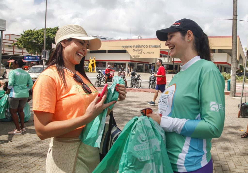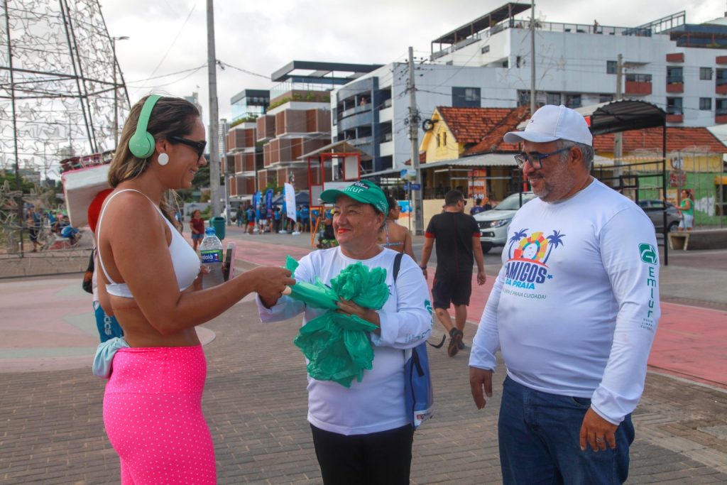 Os agentes ambientais entregam sacolinhas para que as pessoas possam acondicionar os resíduos, como embalagens de bebidas e alimentos e, ao sair da praia, descartar nos contentores instalados próximos à calçadinha da orla. Também são entregues sacolas de câmbios aos motoristas que trafegam nas vias do entorno da orla.